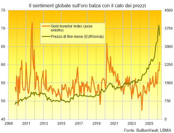 Monitorando ogni mese il numero di acquirenti rispetto ai venditori su BullionVault, il Gold Investor Index rappresenta un indicatore unico del sentiment, basato esclusivamente su decisioni reali di compravendita di oro.